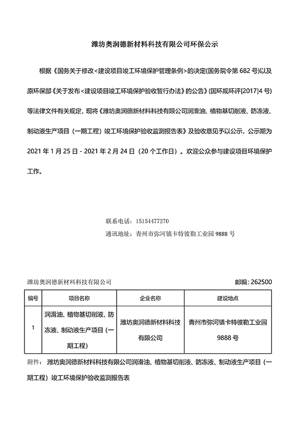 根據(jù)《國(guó)務(wù)關(guān)于修改<建設(shè)項(xiàng)目竣工環(huán)境保護(hù)管理?xiàng)l例>的決定(國(guó)務(wù)院令第682號(hào))以及原環(huán)保部《關(guān)于發(fā)布<建設(shè)項(xiàng)目竣工環(huán)境保護(hù)驗(yàn)收暫行辦法》的公告》(國(guó)環(huán)規(guī)環(huán)評(píng)[2017]4號(hào))等法律文件有關(guān)規(guī)定,現(xiàn)將《濰坊奧潤(rùn)德新材料科技有限公司潤(rùn)滑油、植物基切削液、防凍液、制動(dòng)液生產(chǎn)項(xiàng)目(一期工程)竣工環(huán)境保護(hù)驗(yàn)收監(jiān)測(cè)報(bào)告表》及驗(yàn)收意見(jiàn)予以公示,公示期為2021年1月25日-2021年2月24日(20個(gè)工作日)。歡迎公眾參與建設(shè)項(xiàng)目環(huán)境保護(hù)工作。